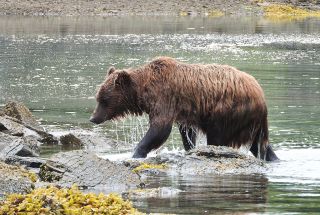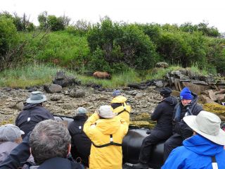 Katmai National Park has the world’s largest population of protected Brown Bears, and by small boat it is practical to see several bears in a day and to do so very safely from the water. Exploring by Zodiac is the perfect way of searching for them and it is a rare day in Geographic Harbor when there isn’t at least one bear in view. As they do along Japan’s Shiretoko Peninsula, the bears come down out of the brush to patrol the shoreline, following the receding tide, to search for clams in the sand, or to browse the vegetation at the back of the beach. It is a thrilling prospect to watch a bear, to work out its behavior and position one’s Zodiac such that the animal will, in its own time and at its own undisturbed pace, walk past giving stunning views and photographic opportunities. It is an even more thrilling prospect knowing that there will be multiple opportunities like this to observe bears at close range going about their normal lives each day. How I wish that such opportunities existed along the Shiretoko Peninsula. There, although bear watching boats go out, and although chances are quite good, there is rarely the opportunity to watch at close quarters for the boats are hard-hulled and the captains unlikely ever to go close to shore. The advantage with a rubber Zodiac is that one can nudge along in shallow water almost touching the shore and with every prospect of a completely safe close encounter with a bear. With experience of Polar Bears in Arctic Norway and of Brown Bears in Alaska, I know that the safest way of watching bears is from the water, and the most comfortable way of all is from a Zodiac.