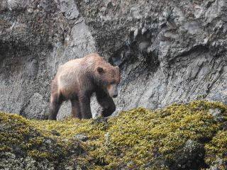 For me, the highlight of any visit to the Alaskan coast is to visit wonderful Geographic Harbor. Nearly hidden at the far reaches of Amalik Bay, Geographic Harbor is set in magnificent volcanic scenery, though on my most recent visit it was shrouded in atmospheric mist. We dropped anchor, sent out our scout boats and were soon on the water for a morning’s Zodiac cruise amidst stunning scenery and offshore islands, taking in sightings of Bald Eagle, Marbled Murrelet, Sea Otter, Harbor Porpoise and half-a-dozen or so Brown Bear. The “harbor” here, takes its name from the 1917 National Geographic expedition to explore the area in the aftermath of the famous 1912 Novarupta eruption (the most powerful eruption of the 20th century) in Katmai. As the weather improved, and where the clouds parted, it was possible to see that the mountain cirques above were draped in grey ash and pumice still remaining from the eruption, making the mountains appear as if they were clad in extensive grey snowfields.