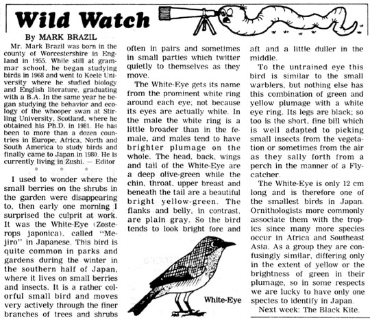 Unknown to me, those first columns, published during my absence from Japan, carried a logo-like cartoon image of a wiggly worm peering through a telescope. I hated it from the beginning, but to my utter chagrin it lasted the first five years of the column’s life, until March 1987. Fortunately, however, the name Wild Watch that I’d first suggested continues in use to this day — though I should have copyrighted it back in 1982, as the Internet shows it has been much copied since. Only in very recent years has my “mug shot” appeared alongside my byline.