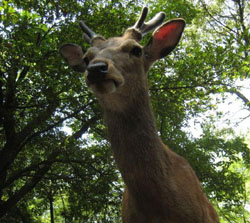 Speaking of Grey herons, though, my favorite this year was one that posed like a statue in front of the famous stone lantern in the Kenroku-en garden in Kanazawa, Ishikawa Prefecture. In contrast, a tanuki Raccoon dog moved fast and nervously as it came out into full view a short walk behind the shrine at Miyajima in Hiroshima Prefecture, where there were Sika deer in abundance.